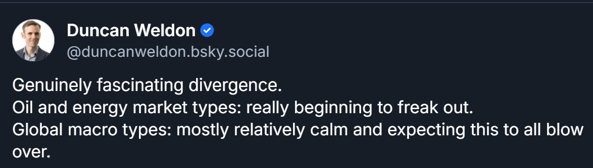 Duncan Weldon put it plainly this week: oil and energy market types are beginning to really freak out, while global macro types remain mostly calm, expecting this to blow over. Joe Weisenthal at Bloomberg called the current combination of signals the most uncomfortable since 2008, citing rising oil, softening jobs, Treasury volatility, and private credit showing stress, while being careful to say we're not on the doorstep of crisis. That carefulness is worth examining. It's not dishonesty. It's the rational posture of people who know that being right about a structural thesis at the wrong time is just as costly as being wrong. You can't trade on a thesis until the signal fires. So sophisticated actors who privately see the risk stay publicly measured. The repricing waits. And so does the damage.